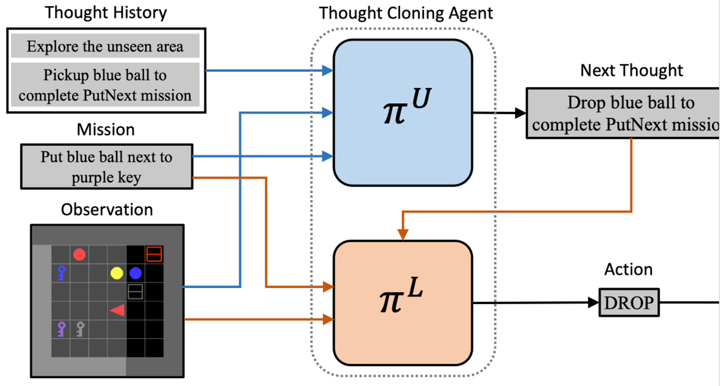 Thought Cloning. Forget CoT. Thought Cloning (TC) is a novel imitation learning framework that enhances AI agent’s capability, to think like humans. Repo, paper: Thought Cloning: Learning to Think while Acting by Imitating Human Thinking.