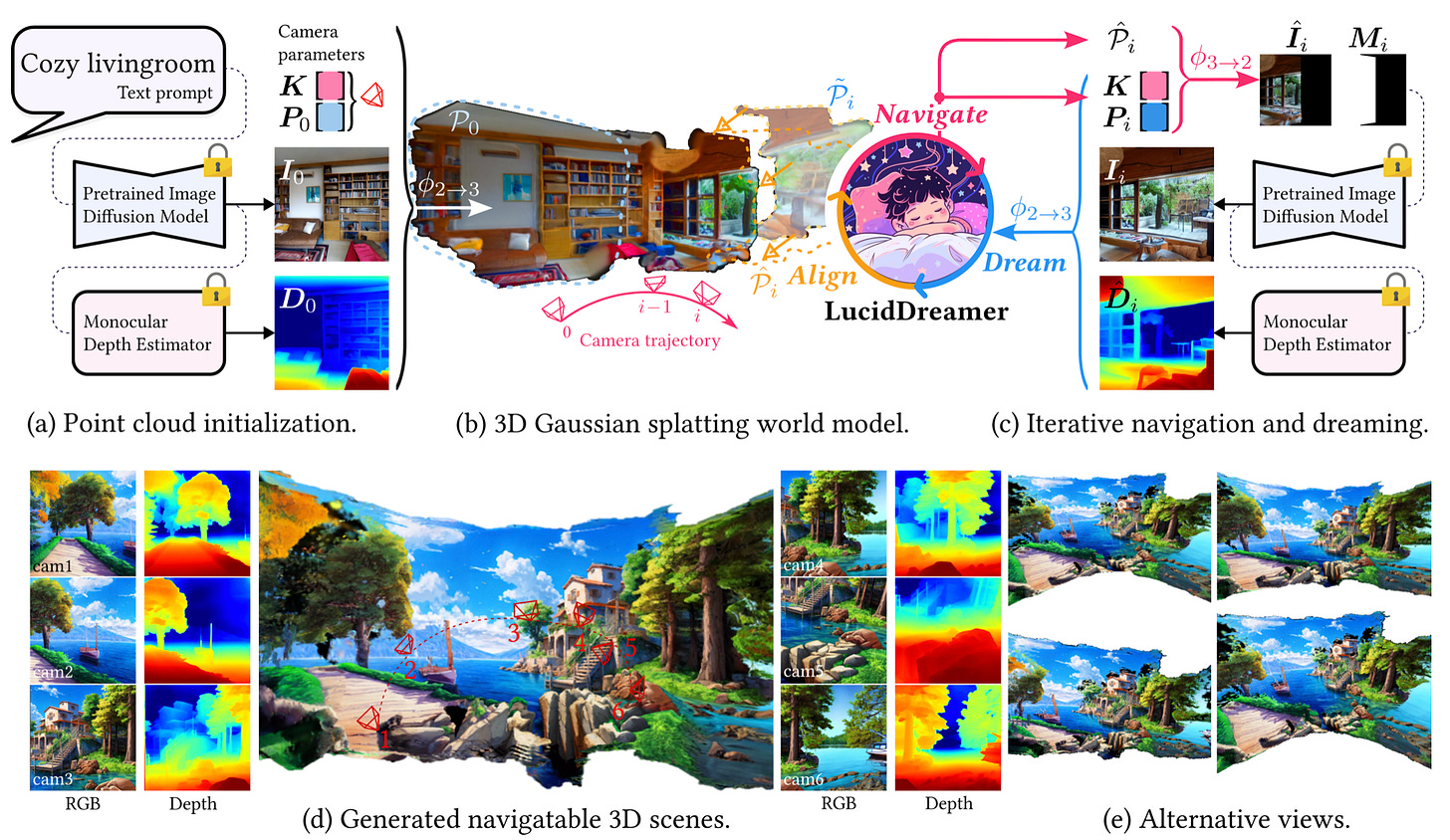 3D scenes generation without domain limitations. Until recently, 3D scene AI Gen models, limited the target scene to a specific domain, primarily due to their training strategies using 3D scan dataset. LucidDreamer is a new domain-free scene generation pipeline that fully leverages the power large-scale diffusion models. Checkout the paper, code and demos: LucidDreamer: Domain-free Generation of 3D Gaussian Splatting Scenes.